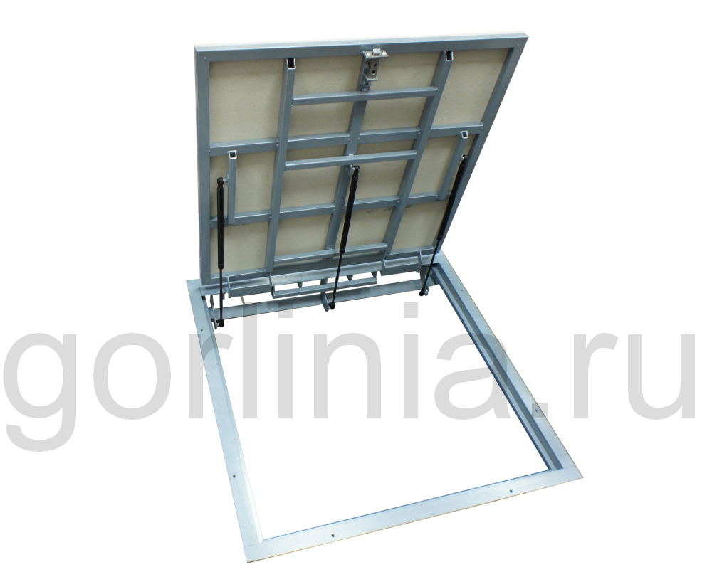 Скрытый напольный люк АМО из профильной балки 30х20 и равнополочного уголка 40х4мм окрашен порошковой эмалью в высокотемпературной камере. Интерьерное изделие оснащено газовыми стойками, скрытыми петлями и регулируемым замком со съемной ручкой. Тип открывания демпферной петли: распашной. Гипсоволокнистое полотно двери и наличник рамы выставлены в нулевую отметку под скрытую облицовку материалом отделки помещения.