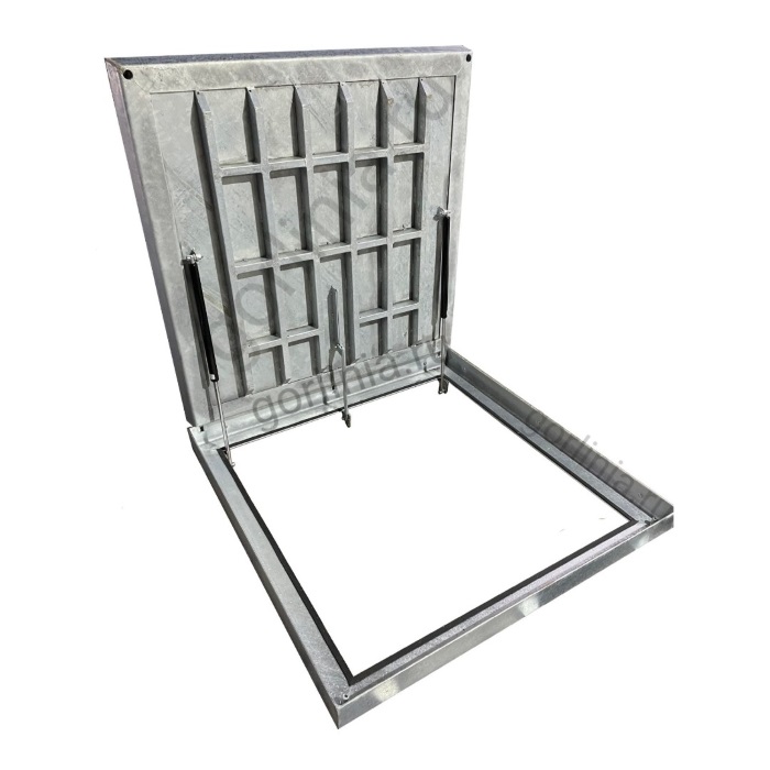 Модель с внешними разъемными шарнирами на болтах для возможности покрытия цинком. Механизм с усиленными газлифтами 2000Н, стопорным устройством автоматической фиксации в открытом положении. Запорное устройство на винтах. Две съемные рукоятки по углам для поднятия крышки. Ленточное эластичное уплотнение по притвору.
