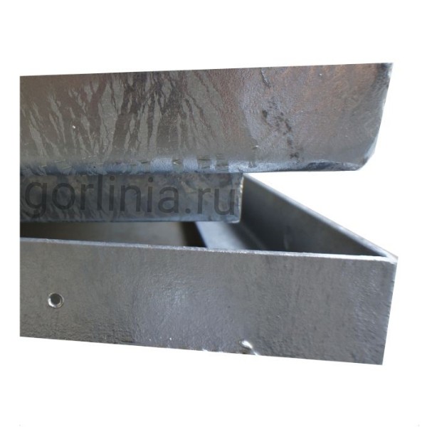 Рама сварена из сортового уголка 50х5. Каркас двери с видимым кантом выполнен с обвязкой из профиля 50х25 с ячейкой 300х300 в осях. Дно крышки закрыто оцинкованным листом 2 мм с расчетной глубиной 20 или 30 мм в зависимости от толщины доски декинга. Элемент петли реализован выносными разъемными шарнирами.