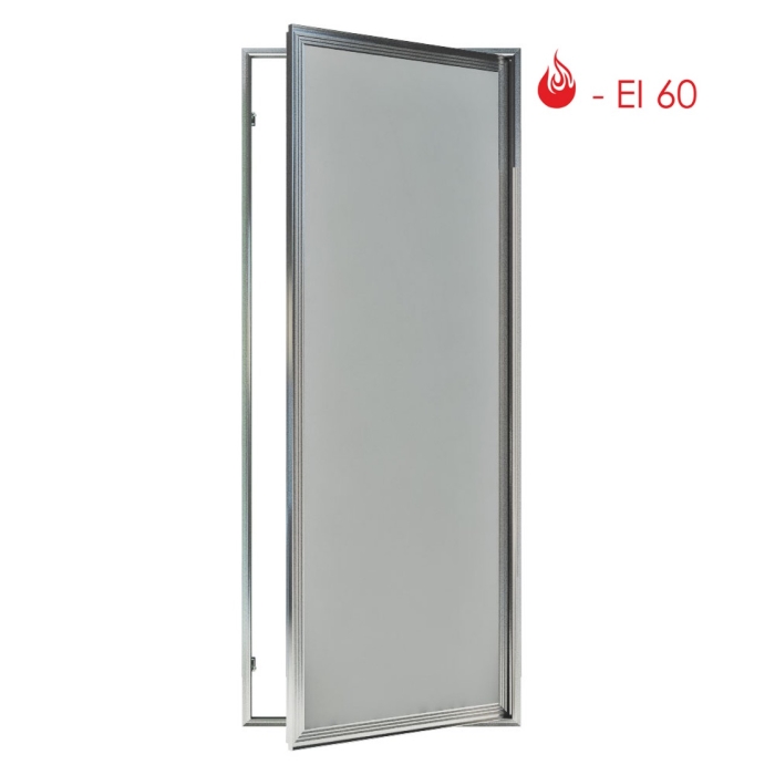Рама из коробчатого профиля без наличников с порогом запрессована на оцинкованных закладных элементах, сварной каркас полотна ходит по распашной траектории на осевых петлях с подшипниками, дверной зазор регулируется по высоте/глубине/горизонтали. Несущая способность ограничена 60 кг облицовочного материала с клеевым слоем на 1 м² створки.